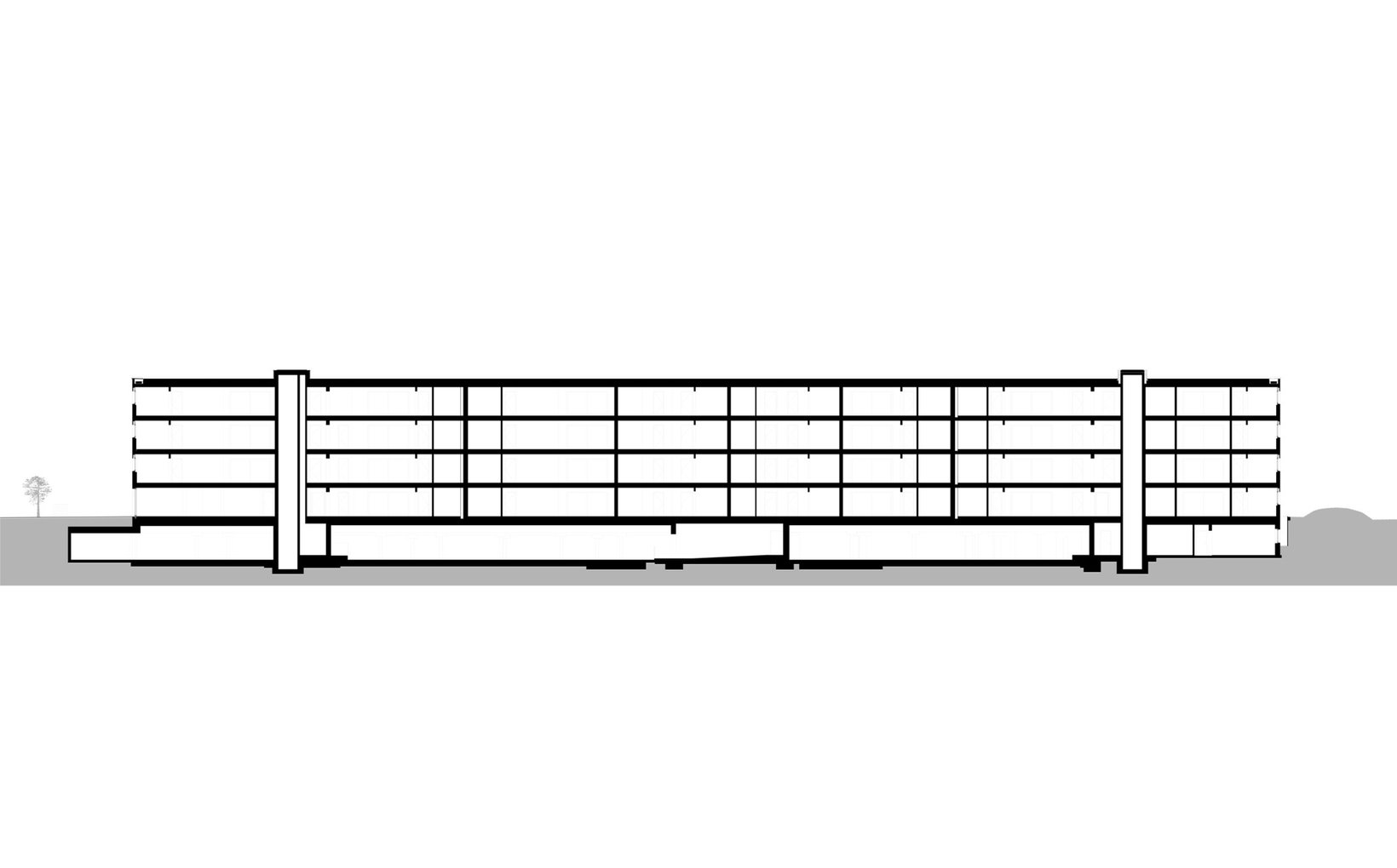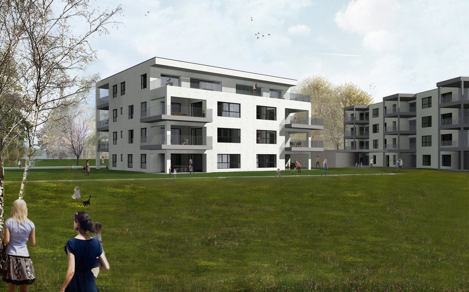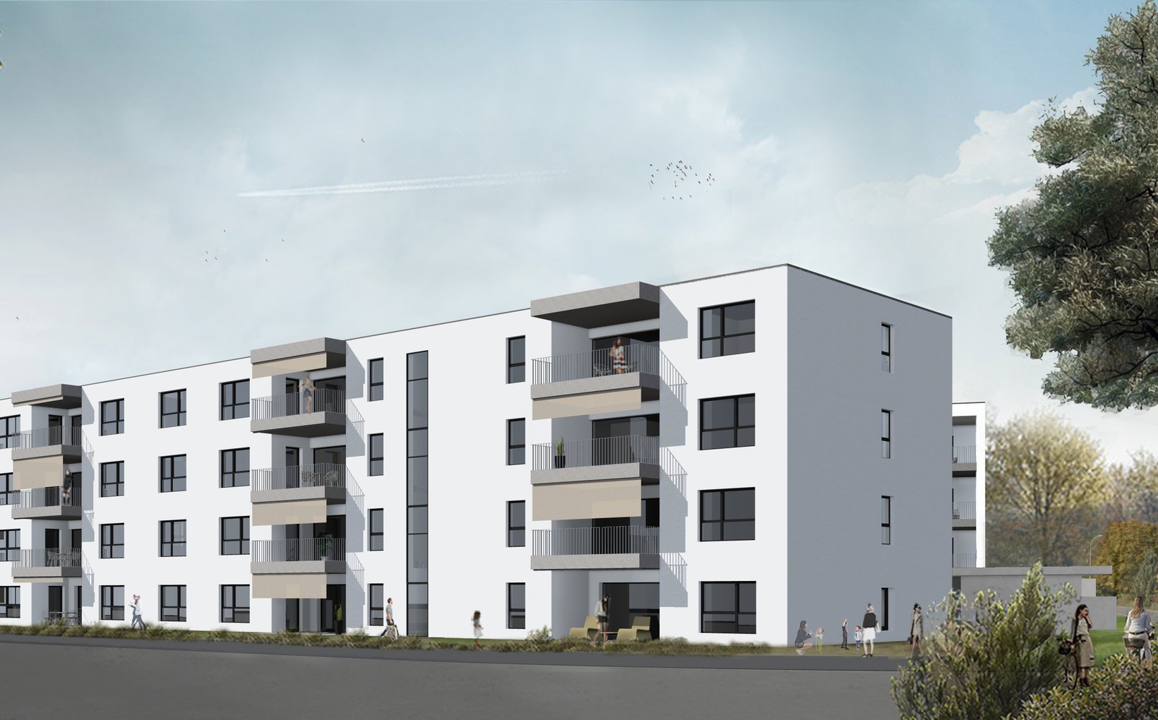 Der 4-geschossige Riegelbau schützt die dahinterliegenden Bauten vor dem Bahnlärm und setzt ein starkes Zeichen im öffentlichen Raum. Eine Nutzung des Erdgeschoss mit Gewerbe / Dienstleistung wird ermöglicht.