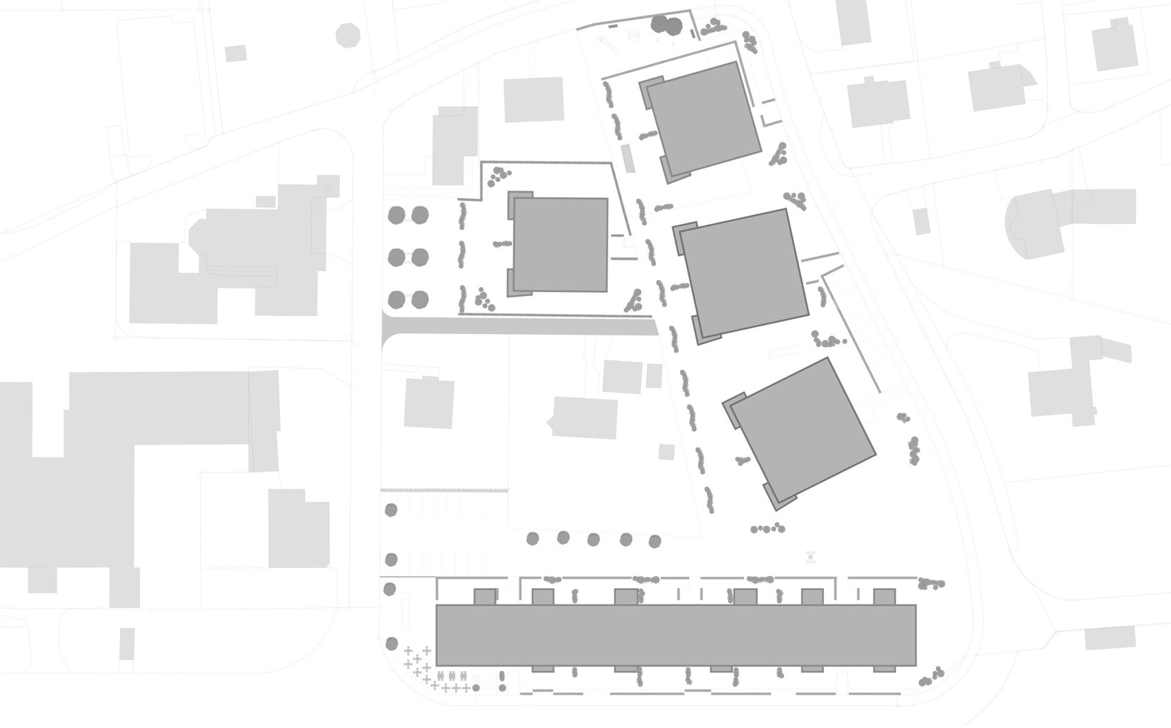 Problemstellung: Gegenüber der Kirche und Restaurant Bahnhof nimmt sich die Überbauung zurück, um durch eine angemessene Umgebungsgestaltung eine Aufwertung des öffentlichen Raums zur erreichen.