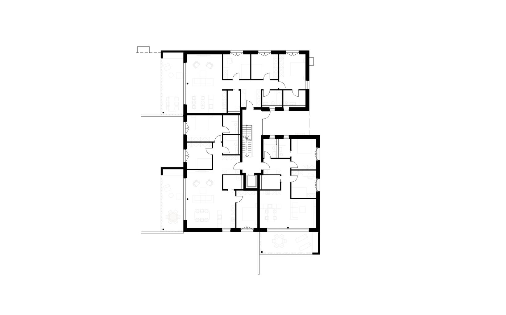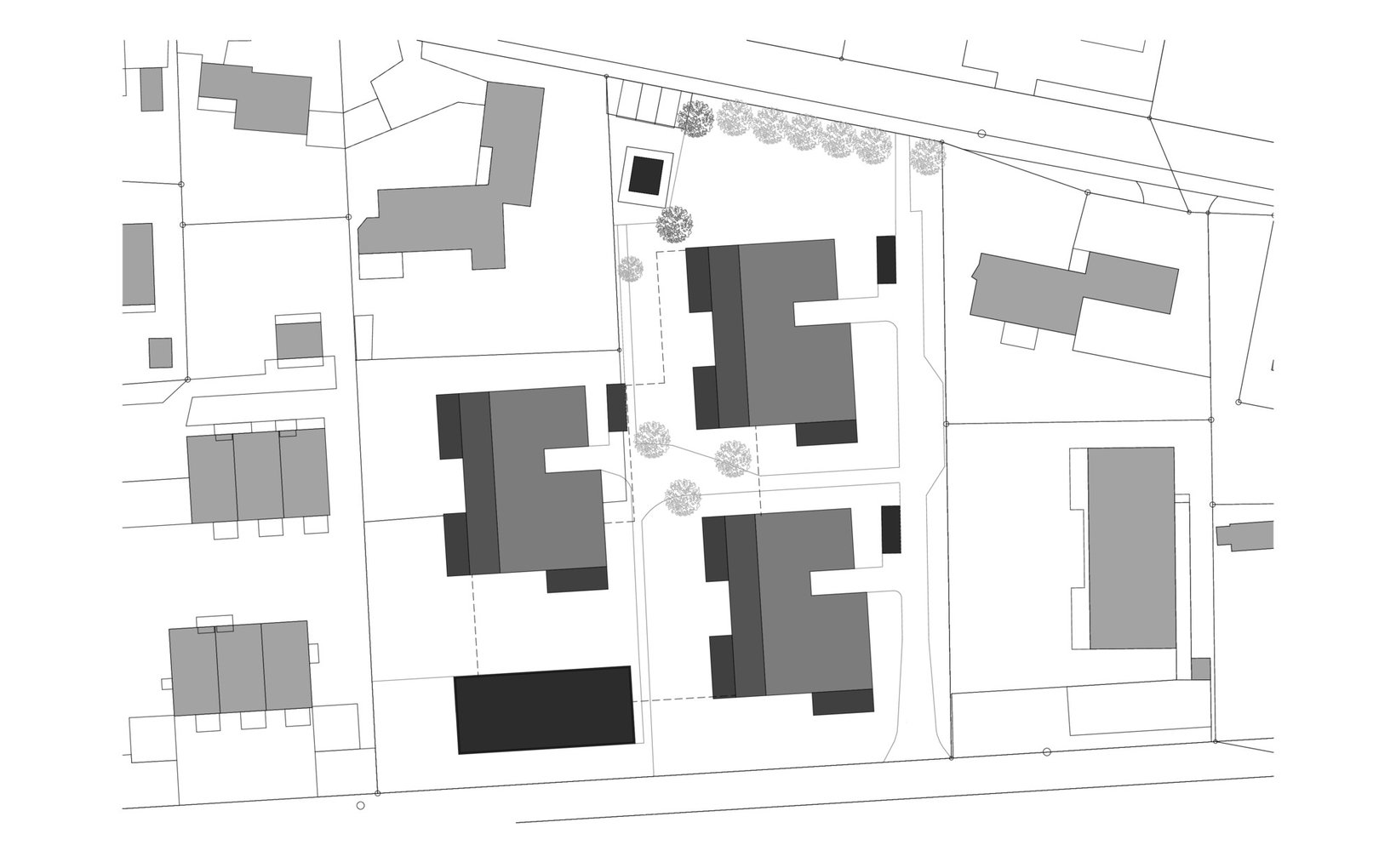 spa: Durch das Erstellen von drei freistehenden Baukörpern wird die Körnigkeit der umgebenden ruralen Siedlungsstruktur aufgenommen. Die geplanten Mehrfamilienhäuser sind nur unterirdisch durch eine gemeinsame Tiefgarage miteinander verbunden. Die Gebäude bestehen aus zwei Vollgeschossen und einem Attikageschoss. Die Häuser sind zueinander leicht höhenversetzt, im Einklang mit der bestehenden Topografie. Die Tiefgarage wird im Gefälle gestaltet, um Abgrabungen um das Gebäude herum zu minimieren.