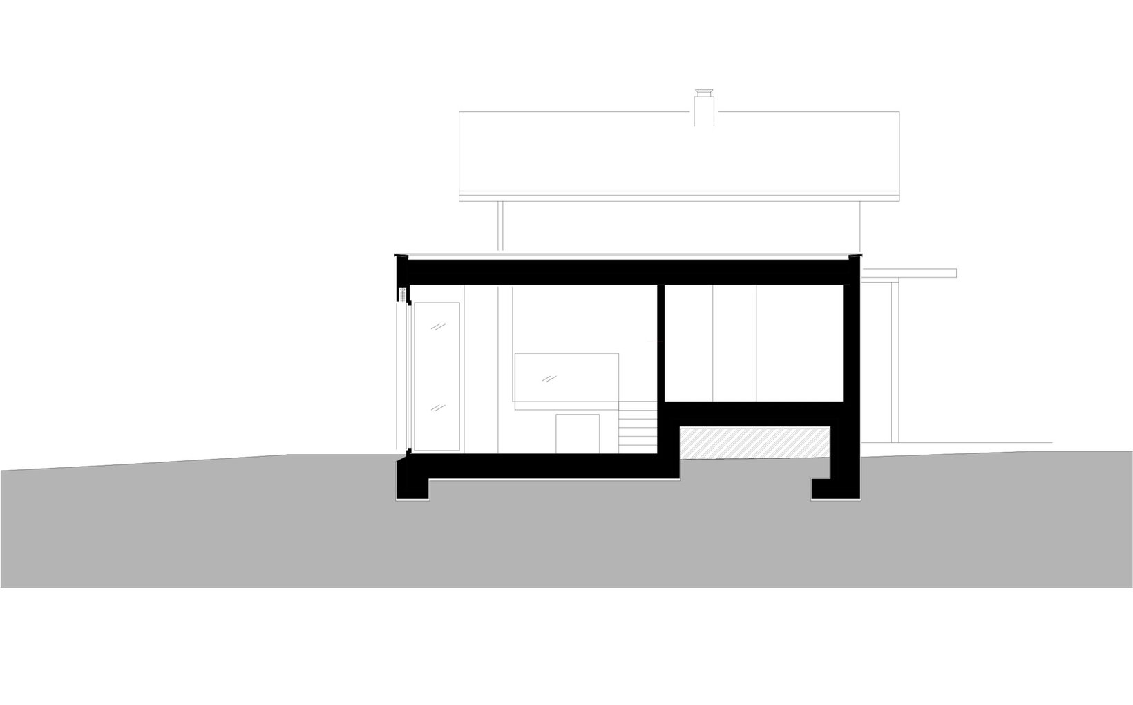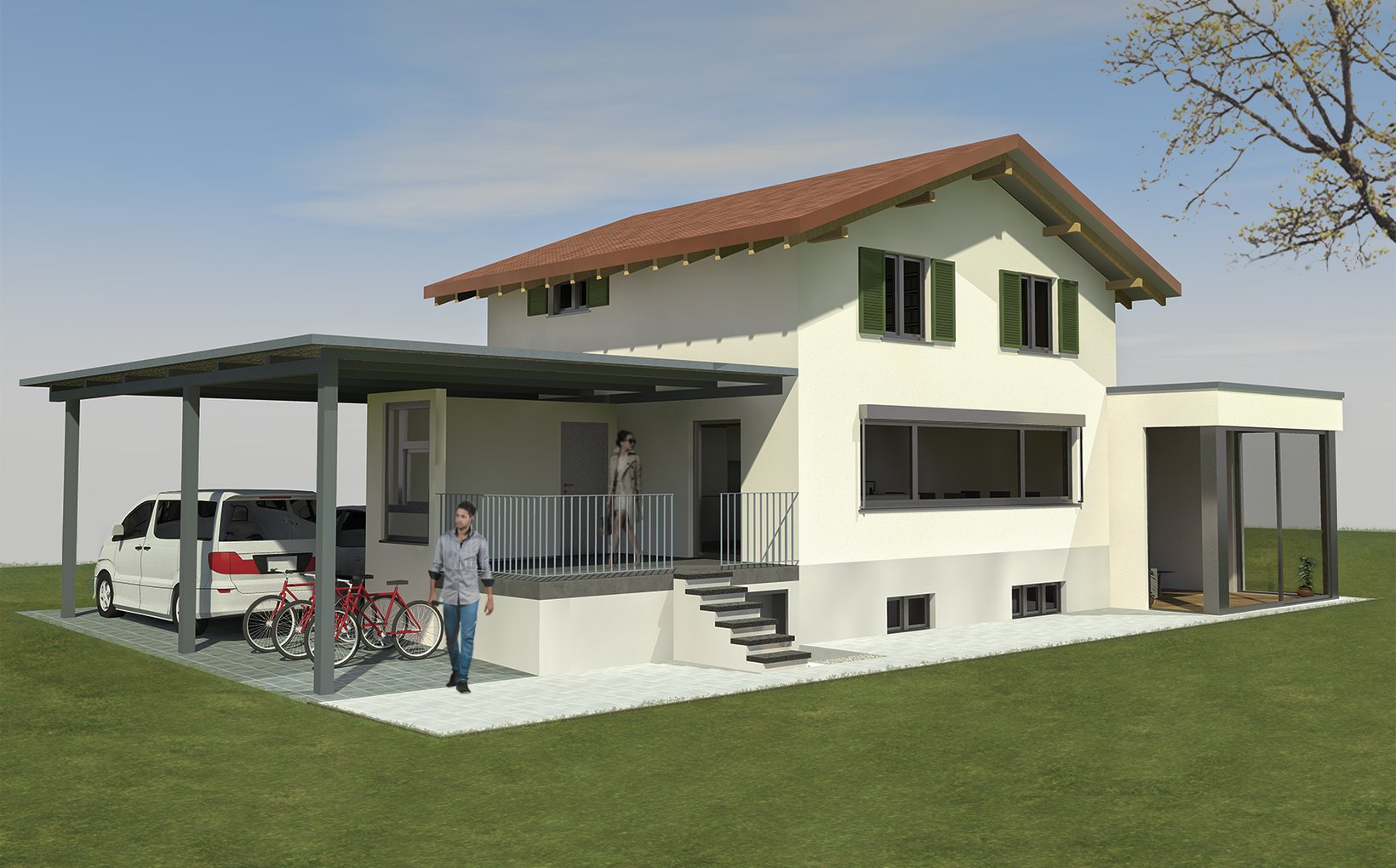 Der realisierte Anbau ist auf Gartenniveau, somit ein halbes Geschoss tiefer als das Bestehende Haus. Im Anbau wurden die Räume mit Wohnen und Elternzimmer erweitert. Die kleine Garage wurde durch einem grosszügigen Carport ersetz. Sämtliche Oberflächen sowie Raumorganisationen sind gestalterisch auf dem neusten Stand. Der Anbau integriert sich optimal in die bestehende Bausubstanz. Die Familie profitiert nun von einem grosszügigen Raumprogramm innen sowie aussen im Garten.