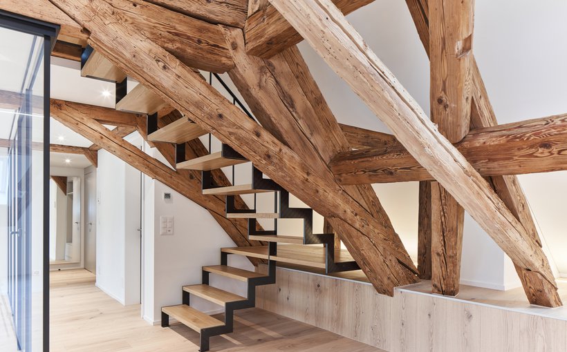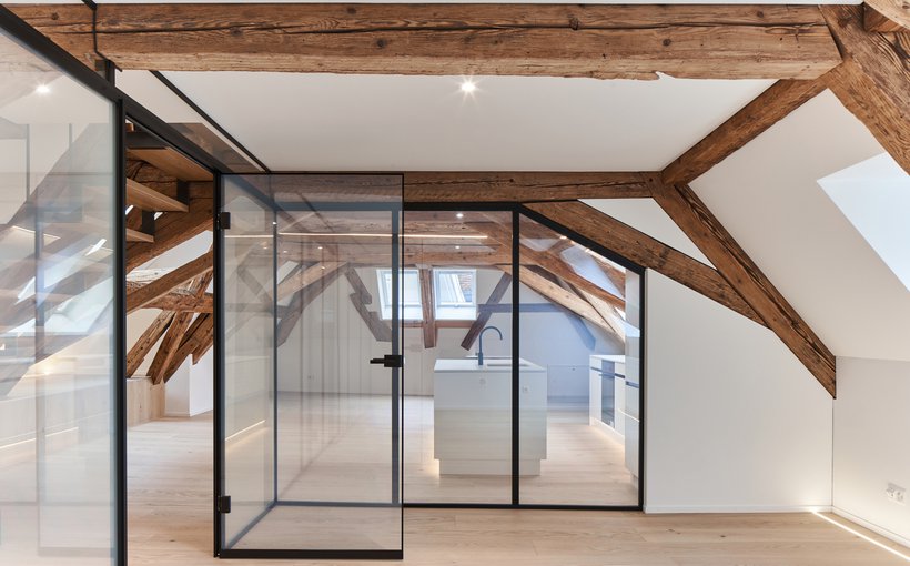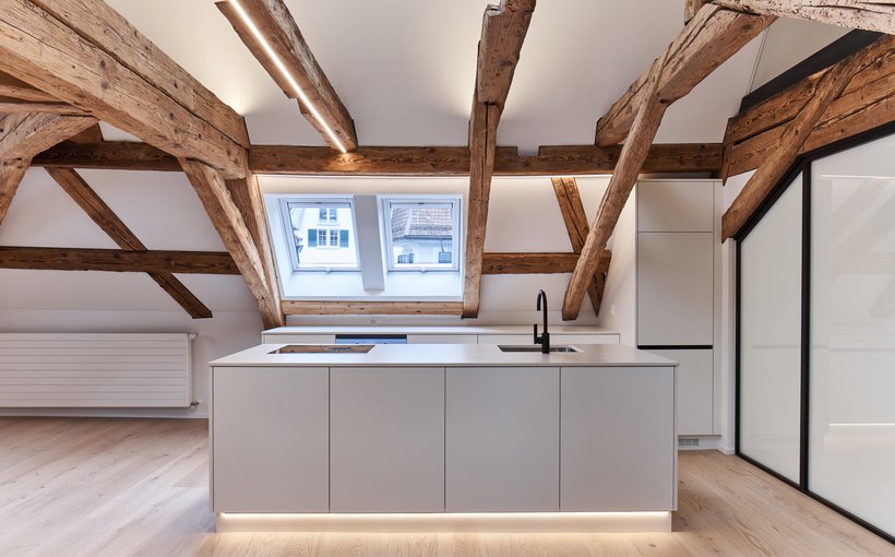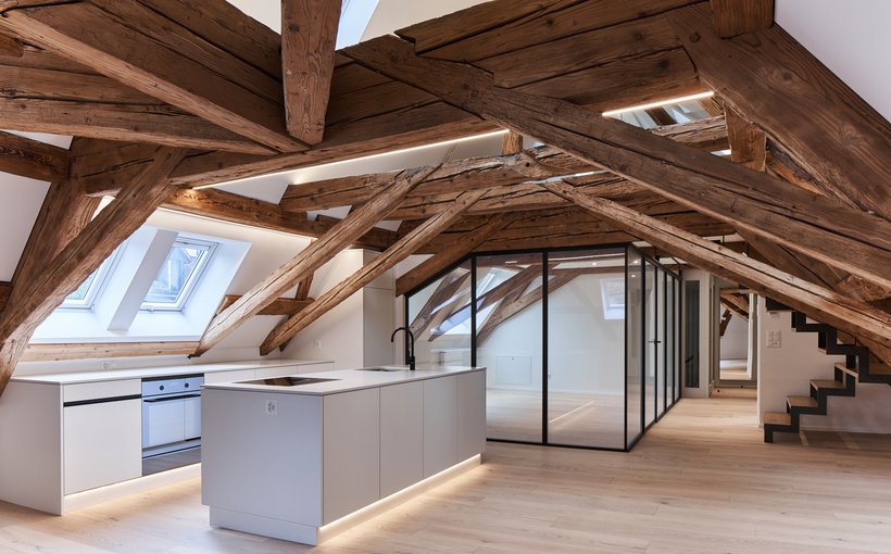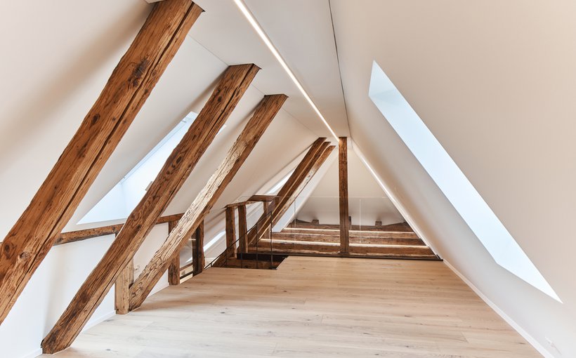 Umbau/Dachausbau einer ehemaligen Bürofläche. Einbau Dachfenster, Sanierung Kanalisation und Steigzonen, Sanierung Treppenhaus inkl. Nasszelle.