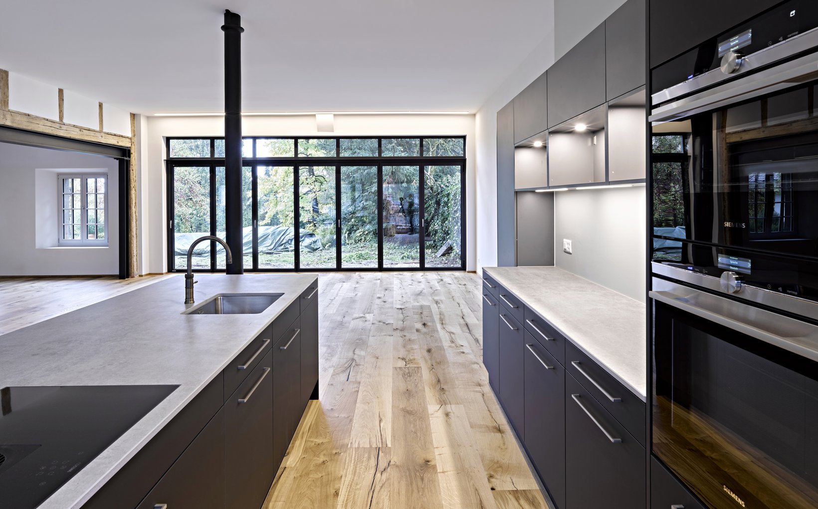 Eindrücklich ist ebenfalls die grosszügige Faltverglasung in der Wohnküche im Erdgeschoss, durch welche ein Einblick in den schönen Garten in direkter Altstadtnähe genossen werden kann.