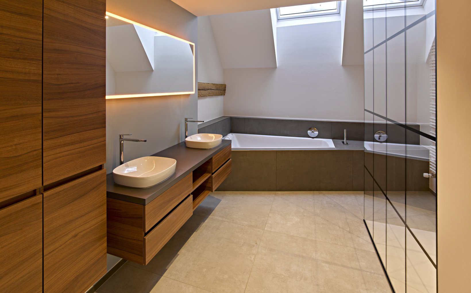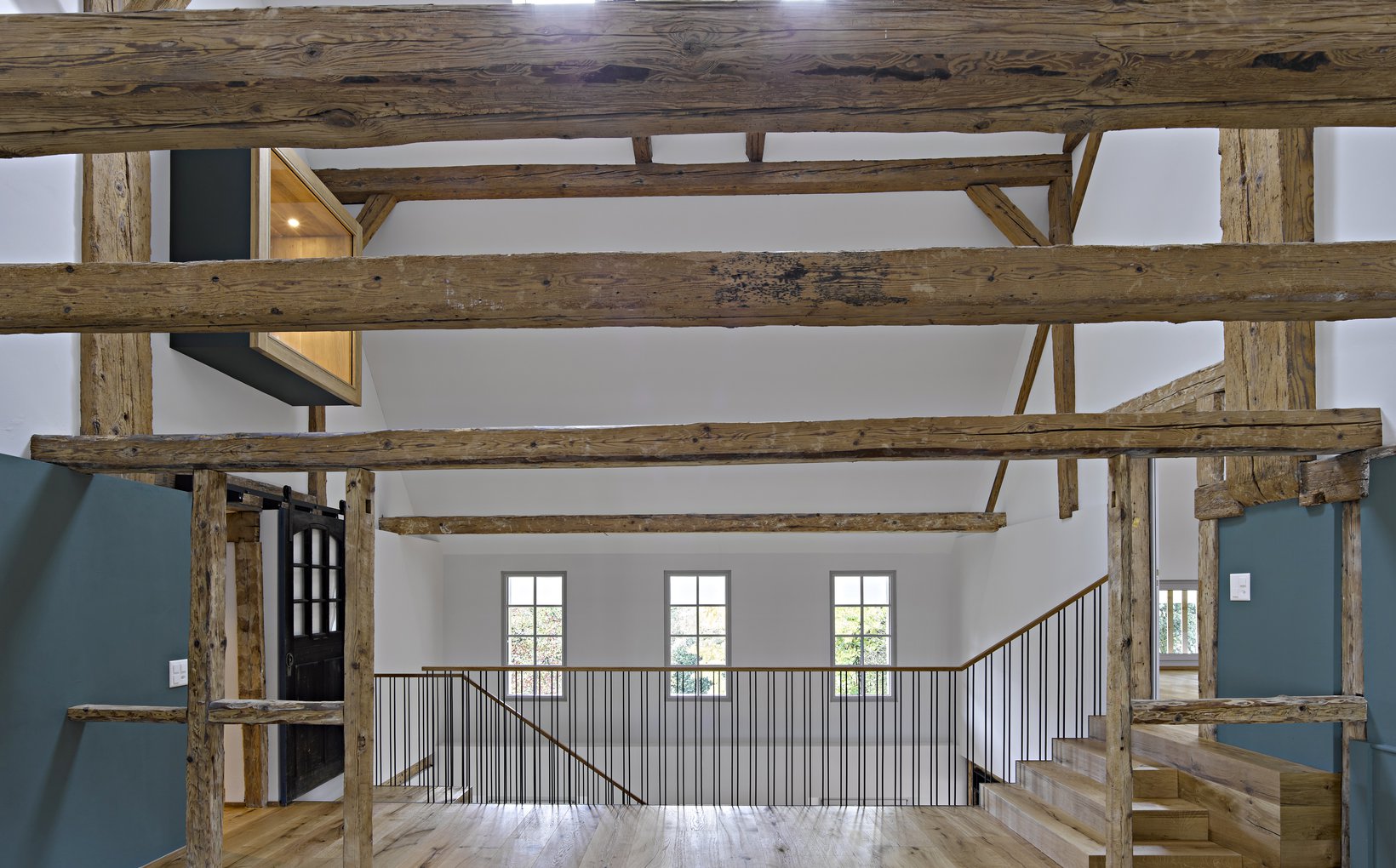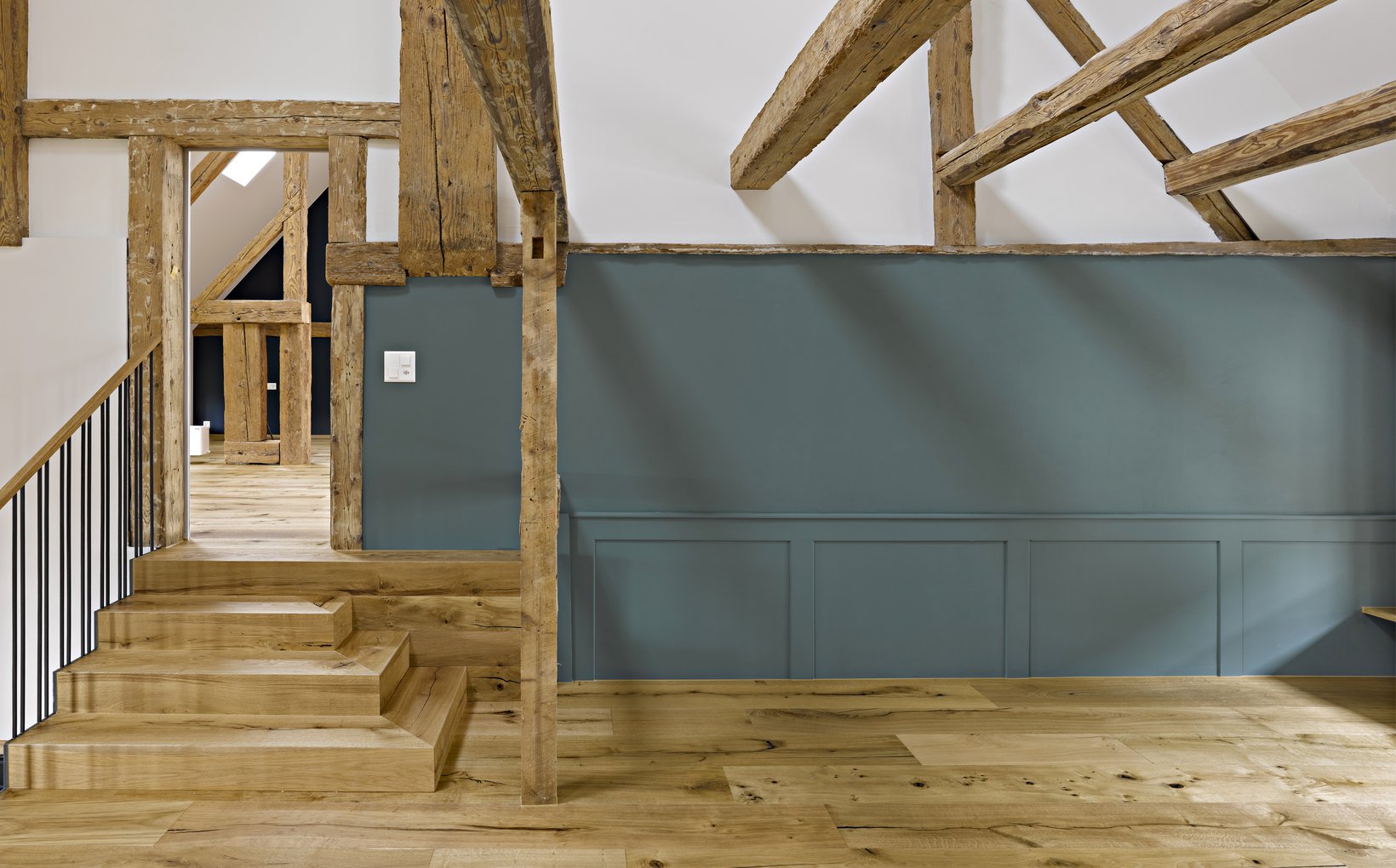 spa: Die bestehenden, alten Holzbalken der Dachkonstruktion im Obergeschoss treten in Kombination mit den grosszügigen hohen Räumen in Erscheinung. Beim Rundgang durch das Haus sind in jedem Raum Details zu finden, welche es zu einem einzigartigen Schmuckstück machen.