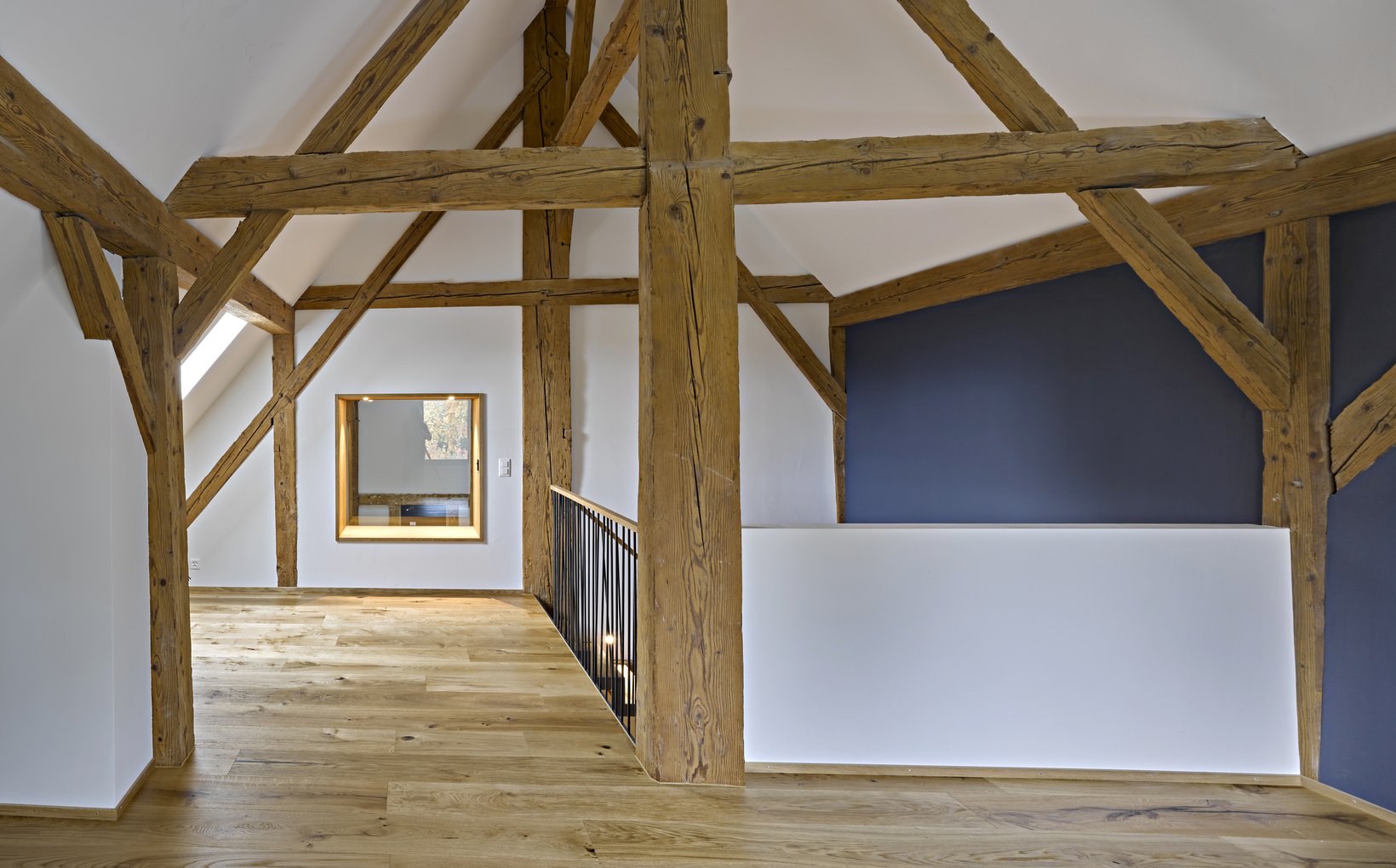 Das Sitzfenster im ausgebauten Dachgeschoss mit Ausblick ins Wohnzimmer und zur imposanten Halle lädt zum Verweilen ein.